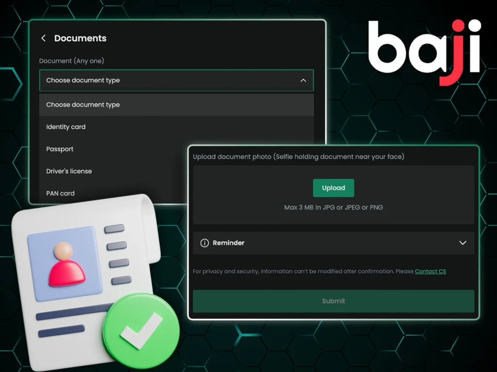 Account verification is an obligatory process for all users of our site, as it helps to ensure fair and secure conditions on the platform, and allows users to make withdrawals of winnings. To pass through the KYC procedure on the Baji online betting site, follow the guide below: