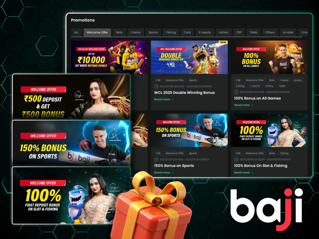 On Baji com we provide a generous system of bonuses and promotions to make our users betting and gambling experience more exciting and profitable. You will find welcome bonus offers, tournaments, cashbacks, reload bonuses, and others.